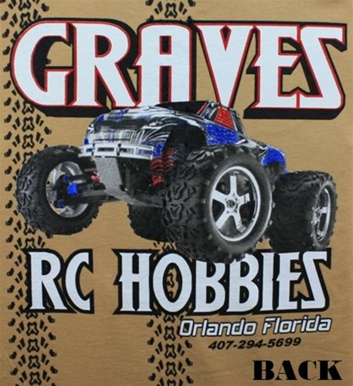 GRAVES RC HOBBIES CAR T-SHIRT, GOLD, LARGE